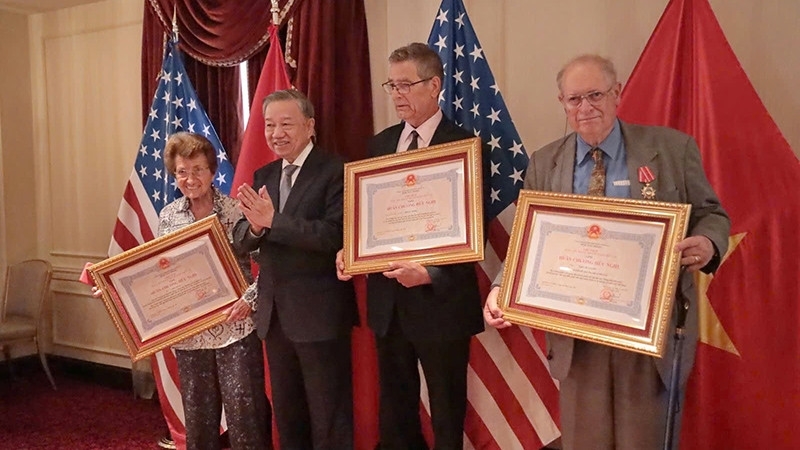 អគ្គលេខាបក្ស និងជាប្រធានរដ្ឋវៀតណាម លោក To Lam (បច្ចុប្បន្នជាអគ្គលេខាបក្ស) ប្រគល់គ្រឿងឥស្សរិយយសមិត្តភាពដល់មិត្តអាមេរិករបស់ប្រជាជនវៀតណាម រួមមានលោកយាយ Cora Weiss ផងដែរ |