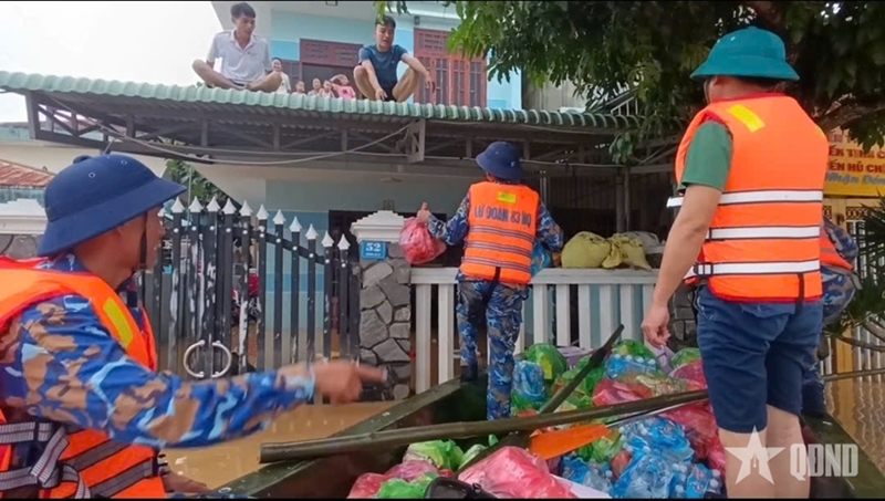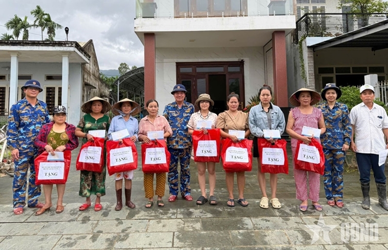 តំណាងនៃកងទ័ពជើងទឹកតំបន់លេខ៣ ផ្ដល់ជំនួយដល់គ្រួសារនៅក្នុងឃុំ Ha Nha (ទីក្រុង Da Nang) ដែលរងការខូចខាតយ៉ាងធ្ងន់ធ្ងរដោយសារទឹកជំនន់