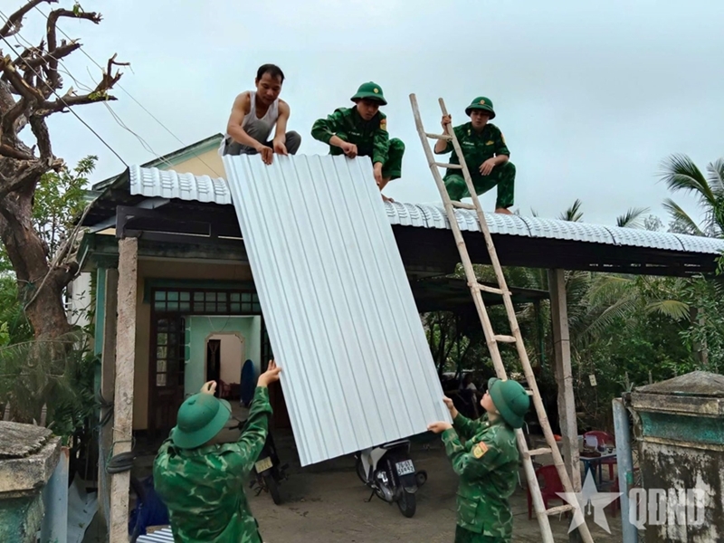 កងទ័ពការពារព្រំដែនជួយគ្រួសាររបស់លោកស្រី Ho Thi Mai (កើតនៅឆ្នាំ១៩៤៣ នៅភូមិ Vinh Phu ឃុំ Long Phung ខេត្ត Quang Ngai) ជួសជុលដំបូលផ្ទះ ក្រោយព្យុះ