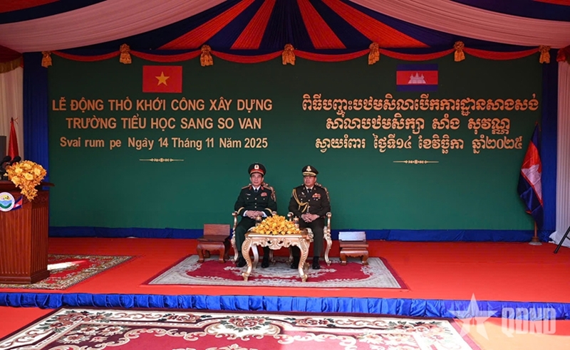 កប.អនឡាញ - ក្នុងក្របខ័ណ្ឌនៃជំនួបប្រាស្រ័យមិត្តភាពការពារជាតិព្រំដែនវៀតណាម-កម្ពុជាលើកទីពីរ នៅព្រឹកថ្ងៃទី១៤ ខែវិច្ឆិកា គណៈប្រតិភូនៃប្រទេសទាំងពីរបានចូលរួមពិធីបញ្ចុះបឋមសិលាបើកការដ្ឋានសាងសង់សាលាបឋមសិក្សា សាំងសុវណ្ណនៅស្រុកស្វាយទាប ខេត្តស្វាយរៀង។