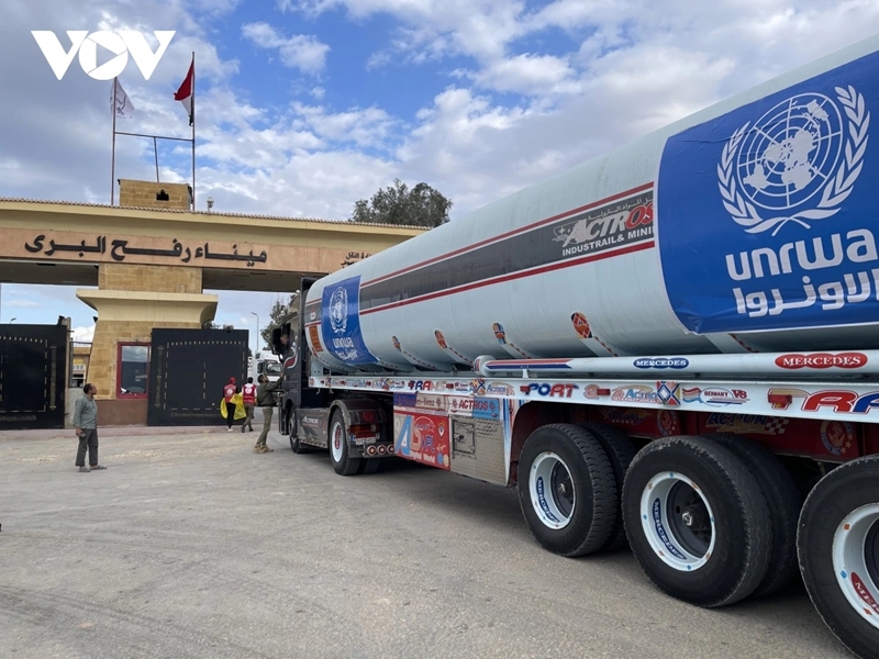 រថយន្តដឹកទំនិញជំនួយមនុស្សធម៌ពីឧបទ្វីបស៊ីណៃរបស់ប្រទេសអេហ្ស៊ីបចូលទៅក្នុងតំបន់ហ្គាហ្សា (រូបថត៖ VOV Cairo) |